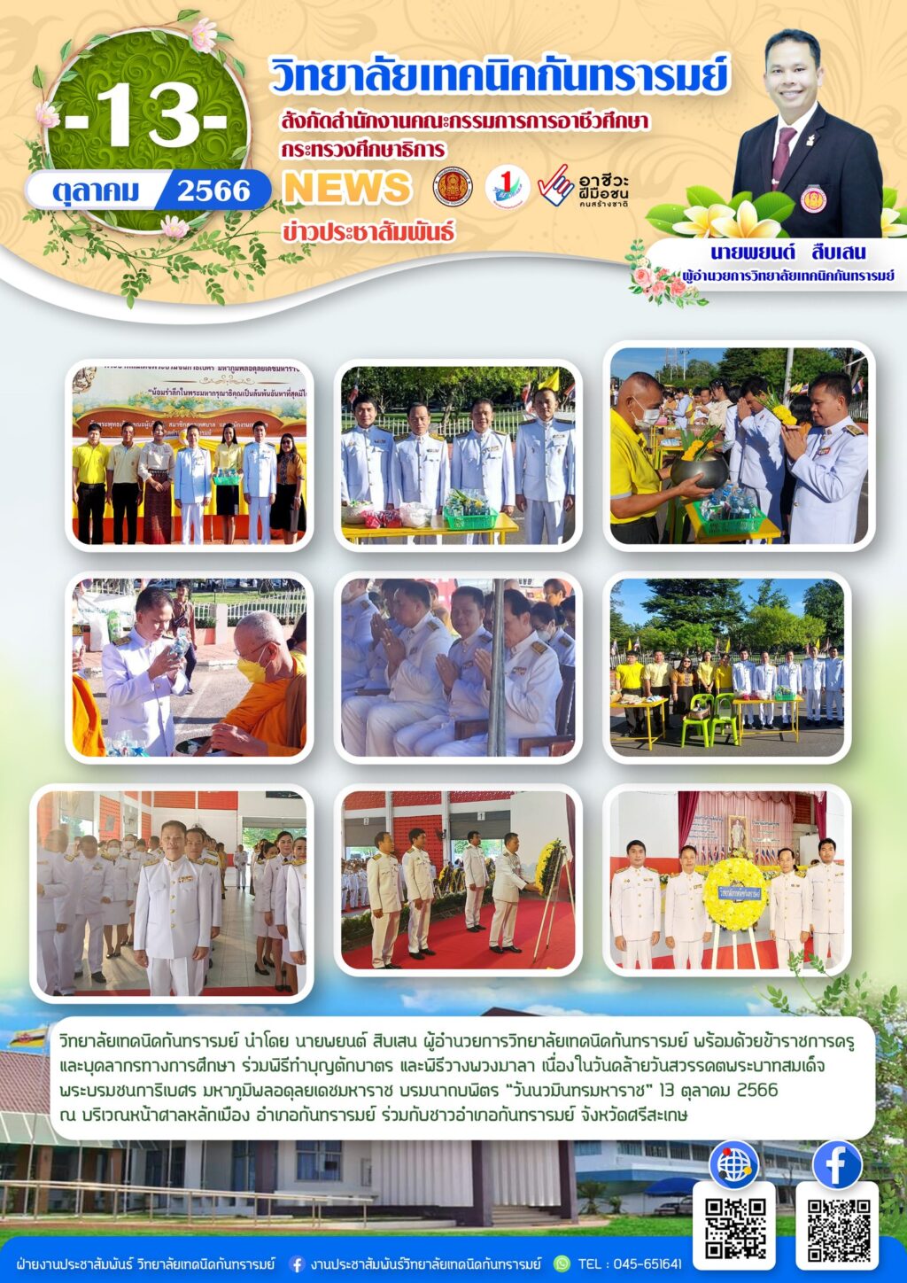 วิทยาลัยเทคนิคกันทรารมย์ นำโดย นายพยนต์ สืบเสน ผู้อำนวยการวิทยาลัยเทคนิคกันทรารมย์ พร้อมด้วยข้าราชการครูและบุคลากรทางการศึกษา ร่วมพิธีทำบุญตักบาตร และพิธีวางพวงมาลา เนื่องในวันคล้ายวันสวรรคตพระบาทสมเด็จพระบรมชนกาธิเบศร มหาภูมิพลอดุลยเดชมหาราช บรมนาถบพิตร “วันนวมินทรมหาราช” 13 ตุลาคม 2566 ณ บริเวณหน้าศาลหลักเมือง อำเภอกันทรารมย์ ร่วมกับชาวอำเภอกันทรารมย์ จังหวัดศรีสะเกษ
