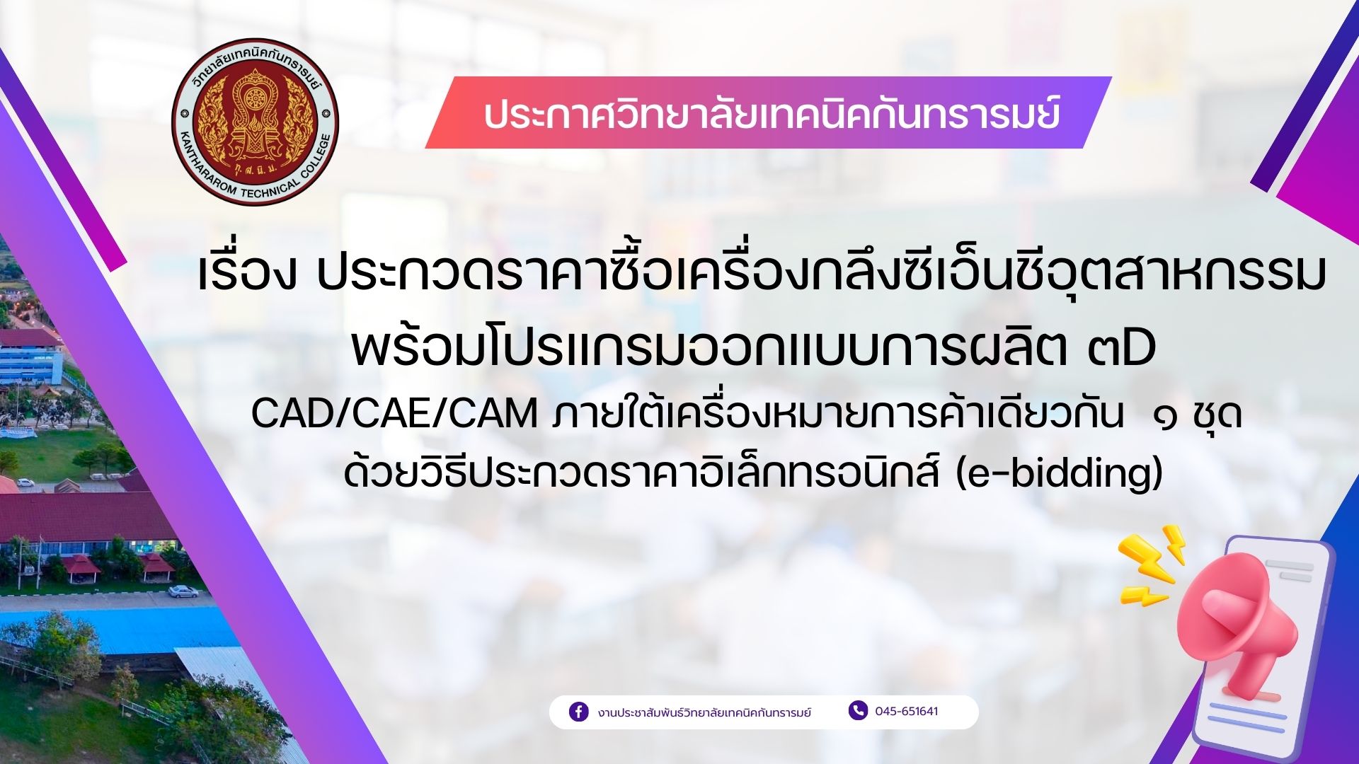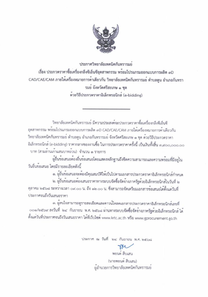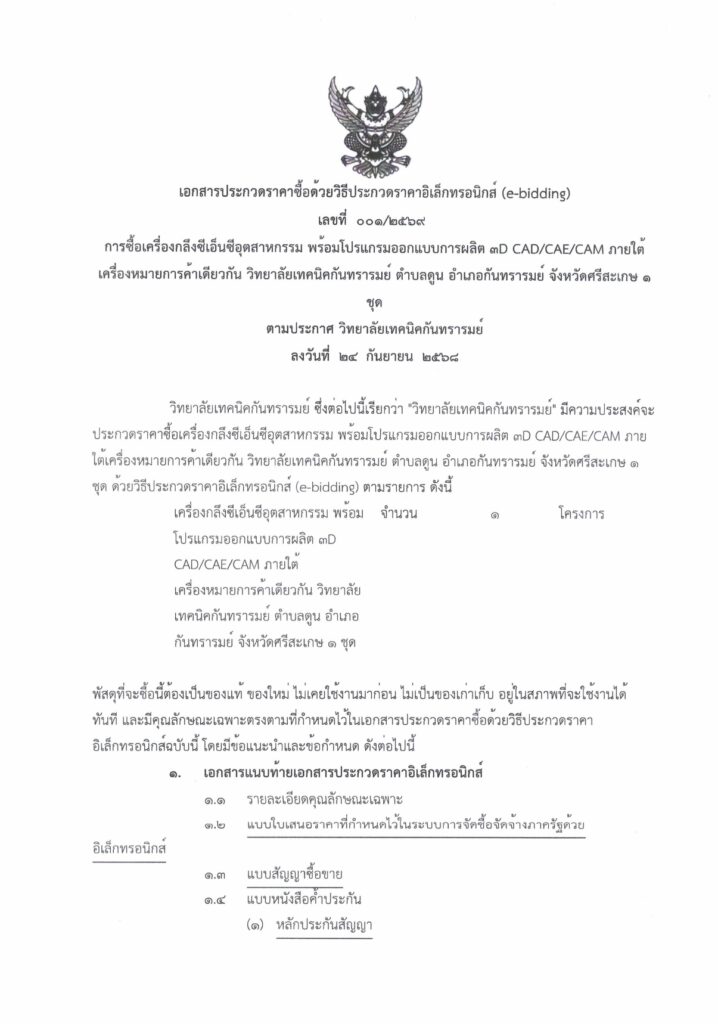 ประกวดราคาซื้อเครื่องกลึงซีเอ็นชีอุตสาหกรรม พร้อมโปรแกรมออกแบบการผลิต ๓D